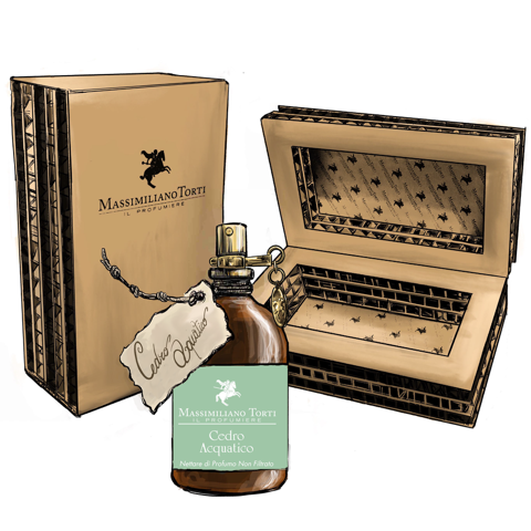 Un favoloso Cipresso verde dona sublimi gocce di resina a Note Metalliche per un effetto “freddo” e quasi intangibile… Poi è il momento delle cortecce dei legni di Cedro dell’Atlantico e di Guajaco per la parte di Carattere e di Cuore del Profumo. Un accordo bizzarro tra Ambra e Cuoio lascia presagire un’immagine avvolta dal mistero e da nubi gonfie di Cristalli Muschiati e Note terrose di Argilla del Guatemala.